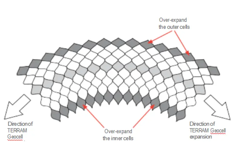 4. DK Geocell panels are very flexible and easily be installed around obstacles such as trees or structures. DK Geocell panels can easily be cut to suit using a sharp knife/scissors or joined together by heavy duty galvanised staples installed with a pneumatic heavy duty stapling plier or UV stabilised nylon cable ties.Changes in gradient and curves can easily be accommodated by either allowing some variations in cell shapes and sizes (over or under expanding the cells) or cutting an entire panel at an angle and then stapling to form a taper or L-shape.