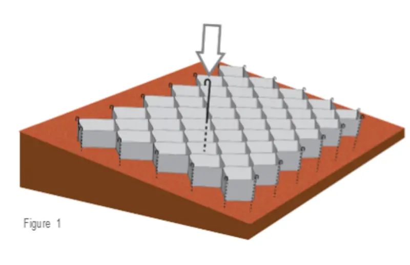 3. Partially open out the Geocell panel and initially pin in place using steel u-bars (or other approved fixings) along the crest of the slope within the anchor trench. Fully expand the Geocell panel down the slope manually pulling into tension so that the cells are fully open but without undue stress. Pin or infill several cells around the perimeter to hold the cells in an open and fully expanded position. Prior to filling fix every cell around the perimeter and generally on an orthogonal grid at 1m centres down and across the slope. Spacing of the Geocell fixings will be determined by the scheme designer and is dependant on the slope gradient, cell size, soil infill depth and the sub grade soil parameters. Please contact DK for further guidance on fixings and the appropriate grade of geocell.