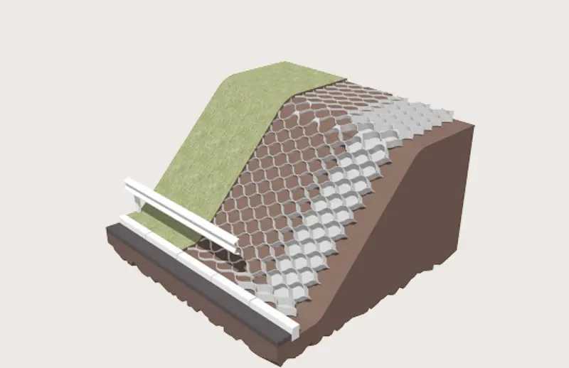 5.Once the Geocell panels has been fixed and anchored in place, in-filling of the cells may be carried out. The infill material should be well graded and a good quality friable topsoil where a vegetated finish is required. The infill material should be carefully placed within the cells in a uniform manner ensuring there are no localised areas which are overloaded. Placement may be by mechanical or manual means preferably commencing at the crest (top) of the slope and progressing downwards. The final depth and compaction of the fill material should be controlled manually, using hand tools, to ensure the Geocells are fully filled and covered by a uniform layer of overburden (typically 20mm deep).