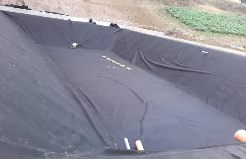 The HDPE geomembrane is 100%waterproof products.The raw material is high density polyethylene and carbon black,mixed in three lay co-extrustion blowing machine. It has good mechanical strength, tensile strength at break 28Mpa, elongation at break 700%. The anti-seepage principle is ordinary physical changes. It is the best choice for environmental protection, aquaculture, and drinking water ponds.